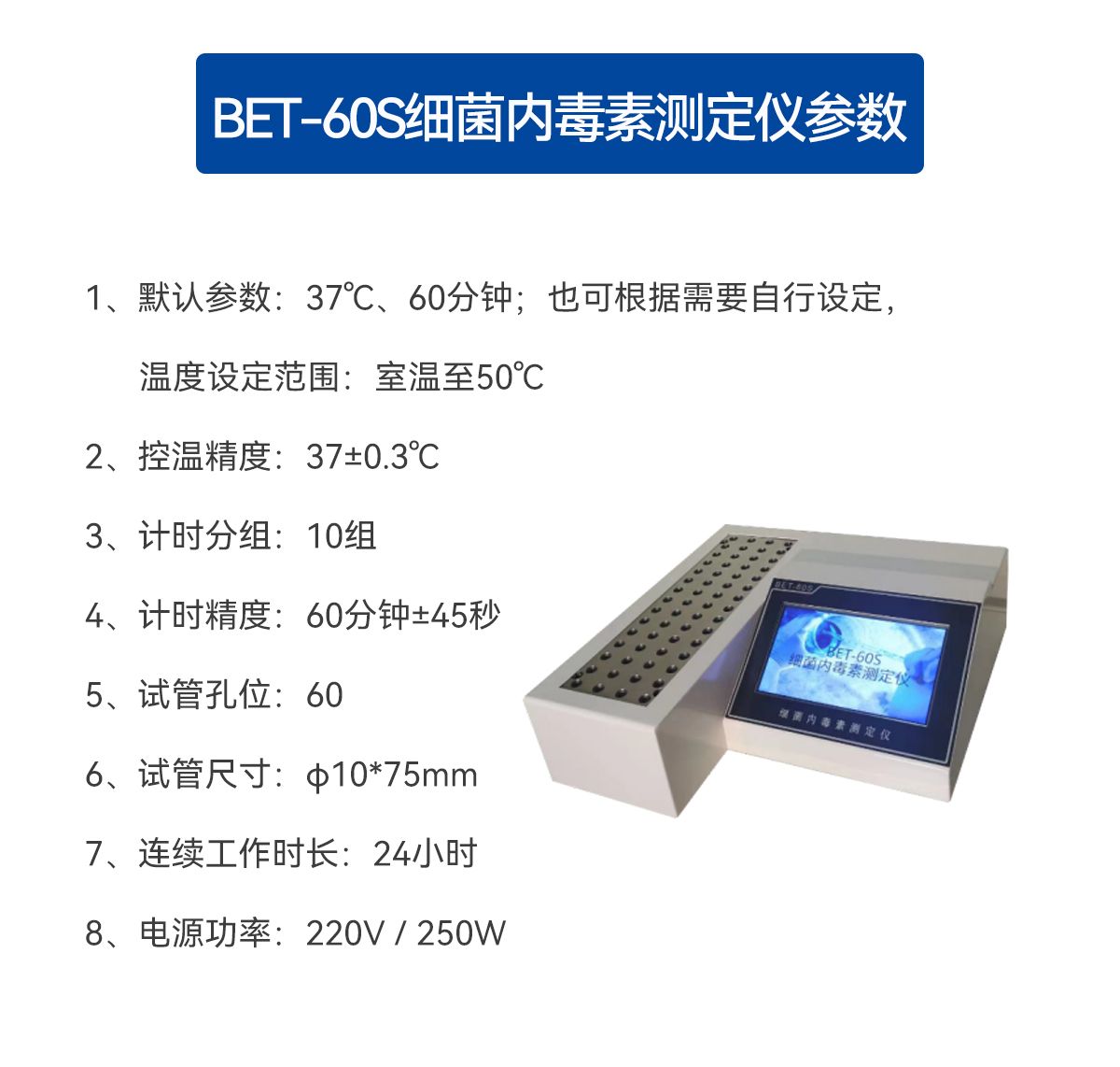 BET-60S型细菌内毒素测定仪根据中国药典“细菌内毒素检查法”,以凝胶法为依据,采用干式固体加热恒温方式,7寸触摸屏,具有分组定时提醒功能。