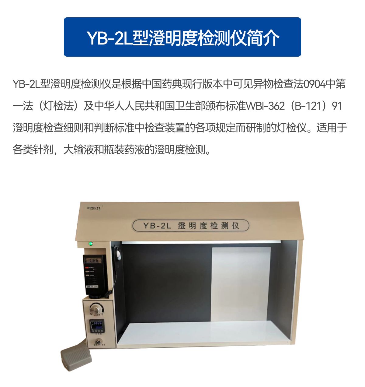 YB-2L型澄明度检测仪是根据中国药典现行版本中可见异物检查法0904中(灯检法)及中华人人民共和国卫生部颁布标准WBI-362(B-121)91澄明度检查细则和判断标准中检查装置的各项规定而研制的灯检仪。适用于各类针剂,大输液和瓶装药液的澄明度检测。