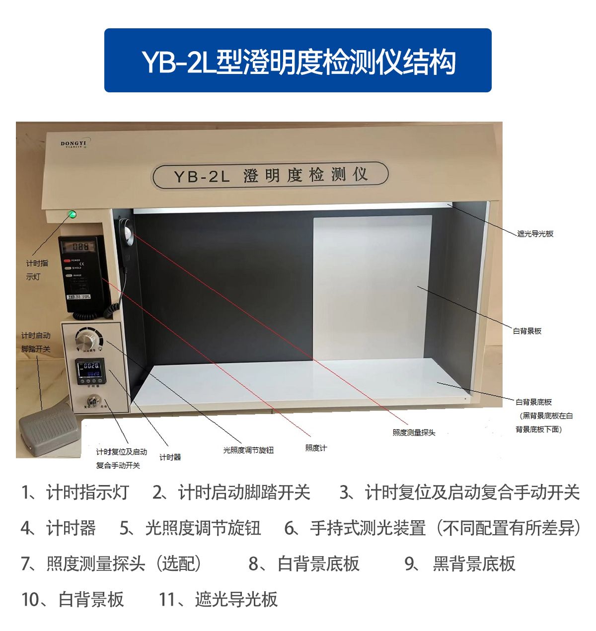 YB-2L型澄明度检测仪遵循标准规定设计,设有反光的遮光板及导光板,背景为不反光的黑色,配有不反光的白色可移动式背景及底板,底板加长式设计,方便大容量药液检测;